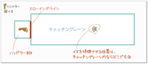 イヌが待機する位置は、キャッチングレーン内ならどこでも構いません。