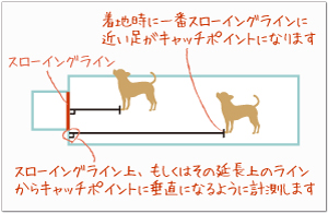 スローイングラインからもっとも近いイヌの足の着地点がキャッチポイントとなります。空中でキャッチした場合も同様です。