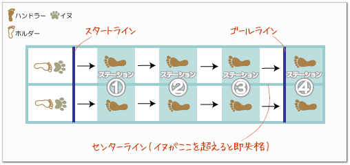 ステーション①〜④に1人ずつ待機します。 - スタートの合図でステーション①のハンドラーは