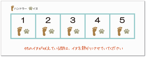 ゲームが始まり自分のペアの番が来るまで、または自分の番が終わった後は、イヌを静かにさせていなければなりません。